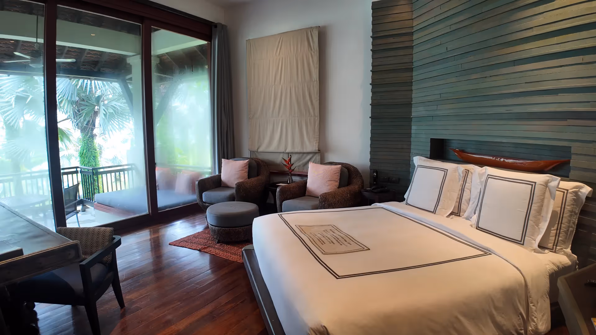 My 35 sqm suite was as much a design statement as it was a place to sleep. The bed’s solid hardwood frame sat against a timber-clad feature wall, flanked by side tables inset with hand-tooled leather. Furniture was bespoke: a solid timber desk and armchairs crafted from woven rattan (or synthetic wicker) with fabric-upholstered cushions for comfort and durability.