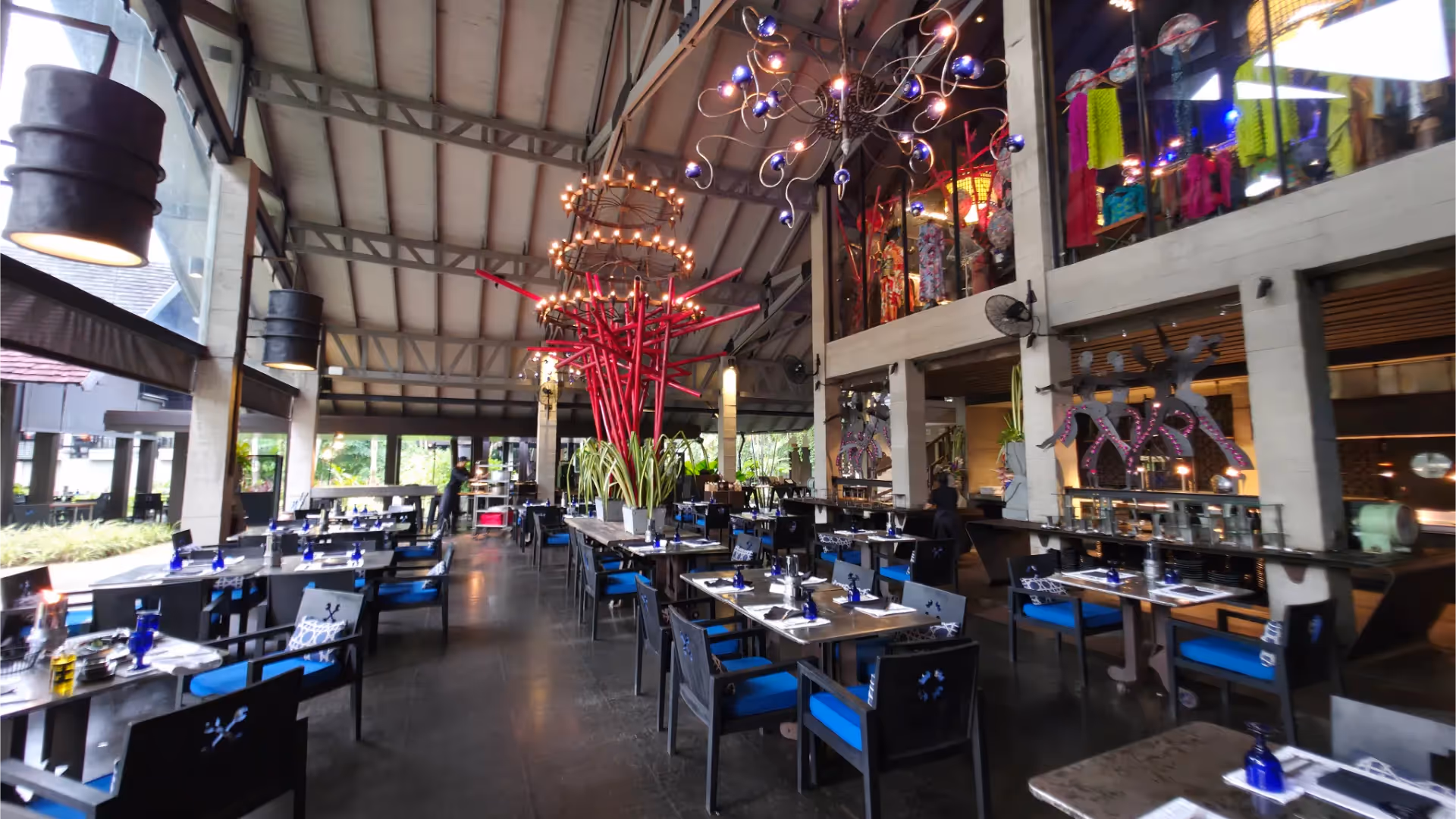On a Muay Thai diet, I wasn’t exactly going to throw myself into a 12-course tasting menu, but the all-day dining restaurant had me covered, even gluten-free options, which are rare in Thailand. The breakfast spread doesn’t aim to compete with the theatrical gastronomy of Atlantis, The Royal, and that’s the beauty of it. Here, the focus is on quality, not spectacle. The dining spaces themselves follow the Bensley formula: open-air pavilions with timber and steel frames, reclaimed floorboard tables, leather-seated chairs stitched by hand, and lighting that changes the mood from bright and breezy in the morning to intimate and warm in the evening.
