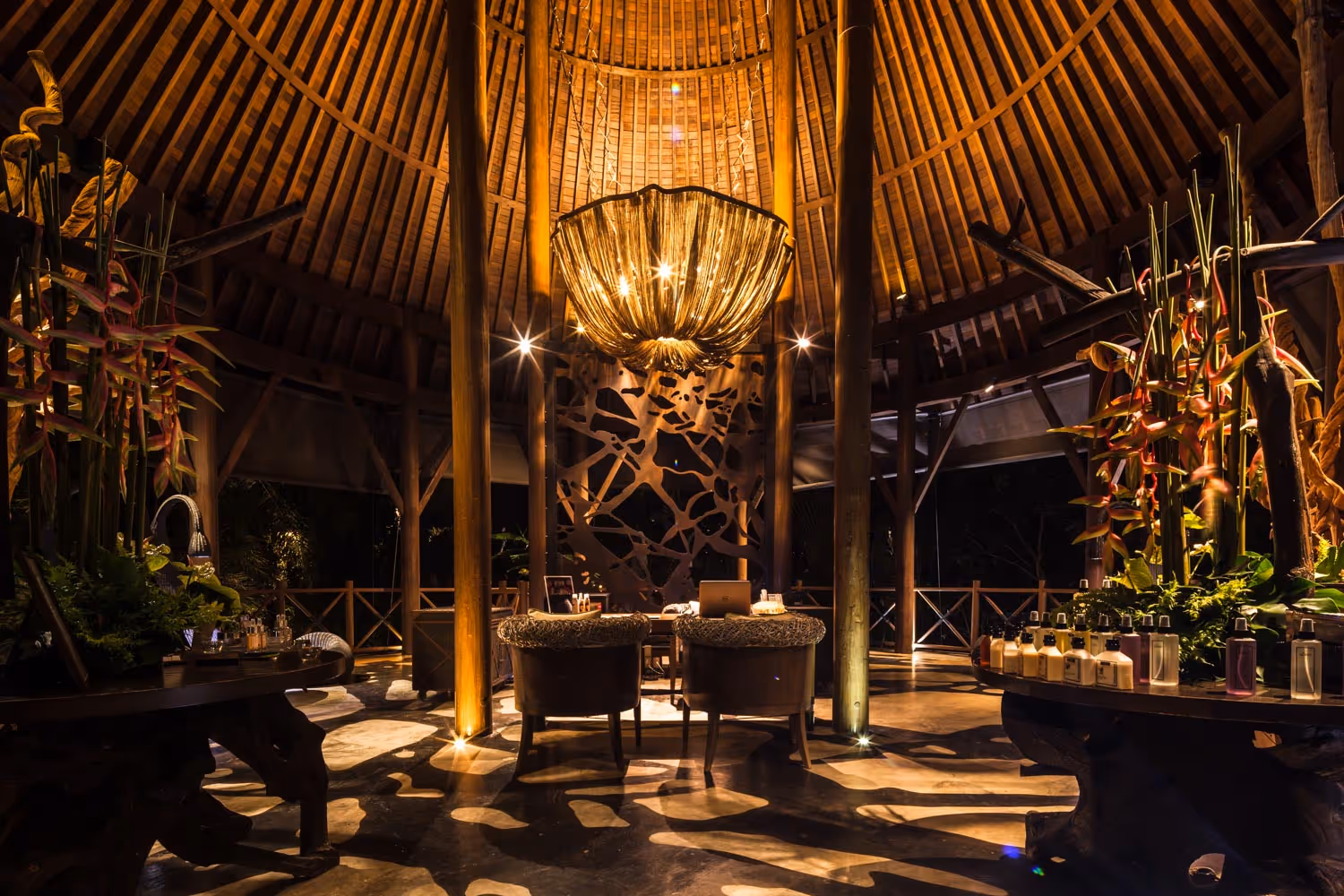The resort’s 177 accommodations, including 7 private Pool Villas, are spread over 25 acres, so it never feels crowded. The landscaping is a study in controlled overgrowth, dense tropical planting that wraps around villas for privacy and softens every hard surface. Pools are lined with volcanic stone, their infinity edges merging with the gardens. The spa sits in its own enclave, with treatment rooms built from reclaimed teak and opening onto private gardens. Even the gym avoids the generic, an open-sided structure with a steel-framed roof and louvred panels for ventilation, so you don’t feel like you’re sweating in a box.